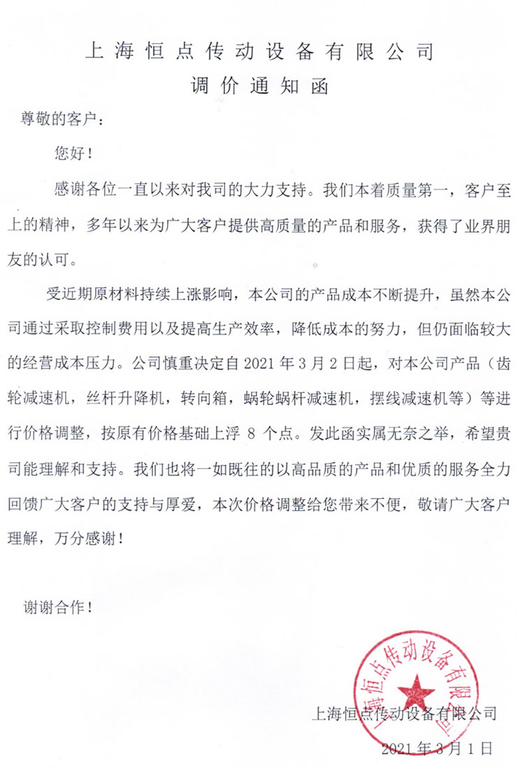 受近期原材料持續上漲影響,本公司的産品成本不斷提升,雖然本公司通過採(cǎi)取控制費用以及提高生産效率,降低成本的努力,但仍面臨較大的經營成本壓力。公司慎重決定自2021年3月2日起,對本公司産品(齒輪減速機,絲杆升降機,轉向箱,蝸輪蝸杆減速機,擺線減速機等)等進行價格調整,按原有價格基礎上浮8個點。發此函實屬無奈之舉,希望貴司能理解和支持。我們也将一如既往的以高品質的産品和優質的服務全力回饋廣大客戶的支持與厚愛(ài),本次價格調整給您帶來不便,敬請廣大客戶理解,萬分感謝!