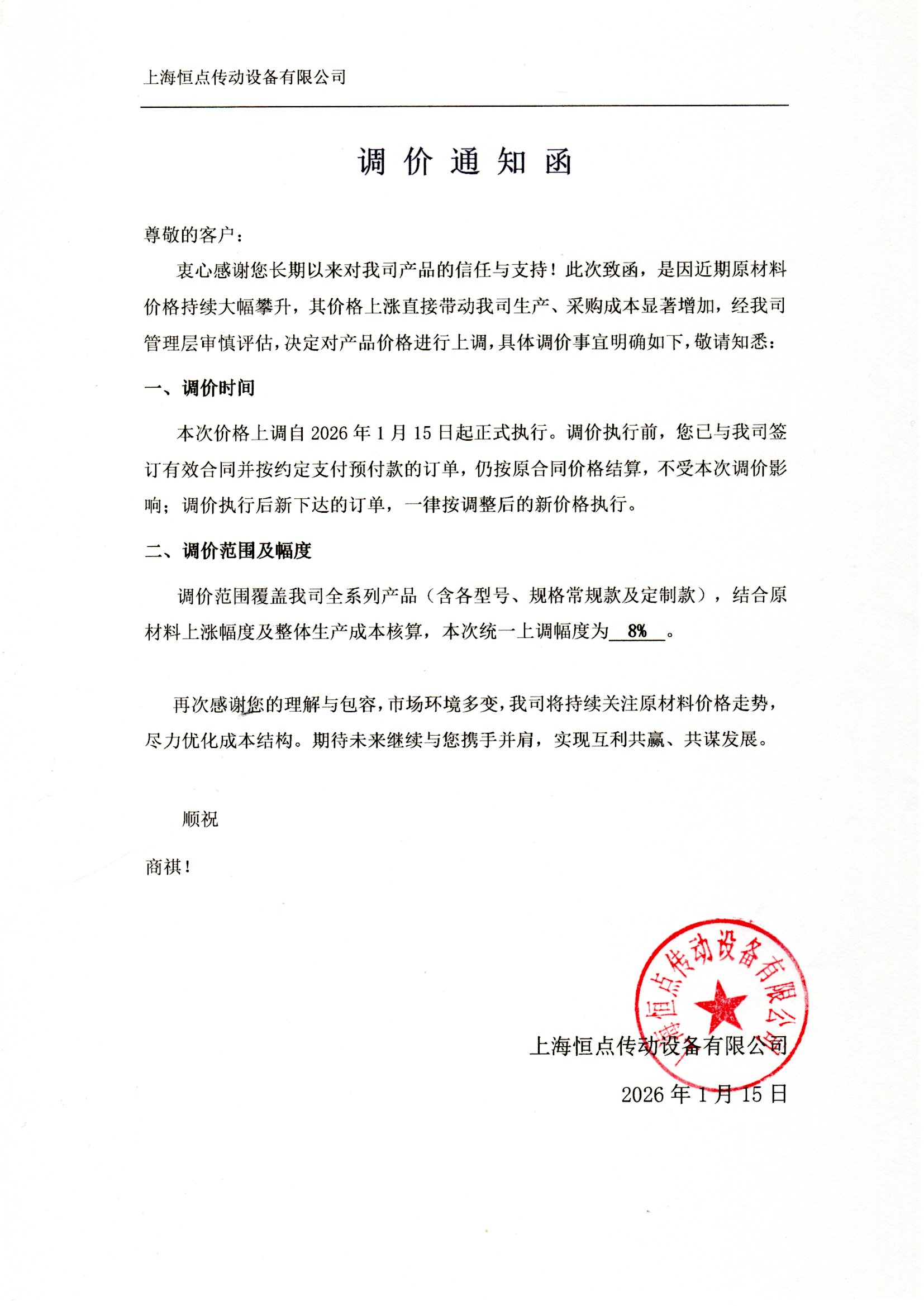 衷心感謝您長期以來對我司産品的信任與支持!此次緻函,是因近期原材料價格持續大幅攀升,其價格上漲直接帶動我司生産、採購成本顯著增加,經我司管理層審慎評估,決定對産品價格進行上調,具體調價事宜明確如下,敬請知悉: