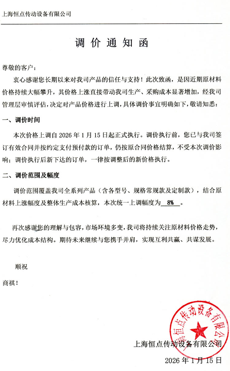 本次價格上調自2026年1月15日起正式執行。調價執行前,您已與我司簽訂有效合同並(bìng)按約定支付預付款的訂單,仍按原合同價格結算,不受本次調價影響;調價執行後新下達(dá)的訂單 ,一律按調整後的新價格執行。