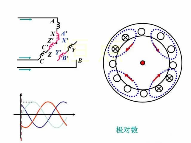 如果A、B、C三相繞組每相分别由兩個線圈串聯組成,每個線圈的跨距爲1/4圓周,那麽三相電流所建立的合成磁場仍然是一個旋轉磁場 ,並(bìng)且電流變(biàn)化一次,旋轉磁場僅轉過1/2轉 ,這就是2對極。同理,如果将繞組按一定的規則排列,可得3對極、4對極或一般地說P對極。P就是極對數 。