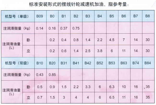 擺線針輪減速機潤滑油 、脂參考量表及潤滑方式