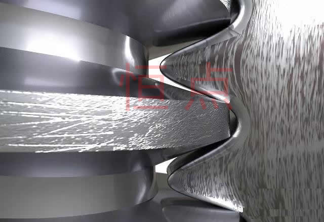 螺旋齒輪(交叉斜齒輪),它們的運動以楔形或螺旋爲主 ,齒面高度滑動,易於裝配 ,具有相同的法向徑槽,它們可以朝同一個方向,也可以朝相反的方向。