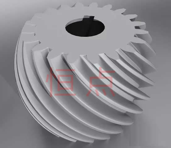 斜齒圓柱齒輪,動力傳遞的方式與直齒輪相同,軸可以是非平行(螺旋輸送器頂部)或平行的。它們的齒相對於旋轉軸是傾斜的,比直齒圓柱齒輪傳遞更多的運動和更高的速度,具流動性好和震動少的特點,但需要較多潤滑油來抑制較快磨損。