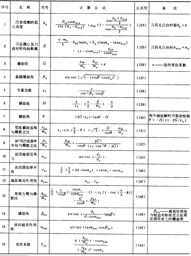 内齒輪的齒形系數YF不僅與齒數和變位系數有關,且與插齒刀的參數有關。爲瞭簡化計算,可近似按替代齒條計算(見圖27)。替代齒條的法向齒廓與基本齒條相假,齒高與内齒輪相同,法向載荷作用角αFen等於αn,並以腳标2表示内齒輪。有關計算公式見表16(适用於Z2>70)。