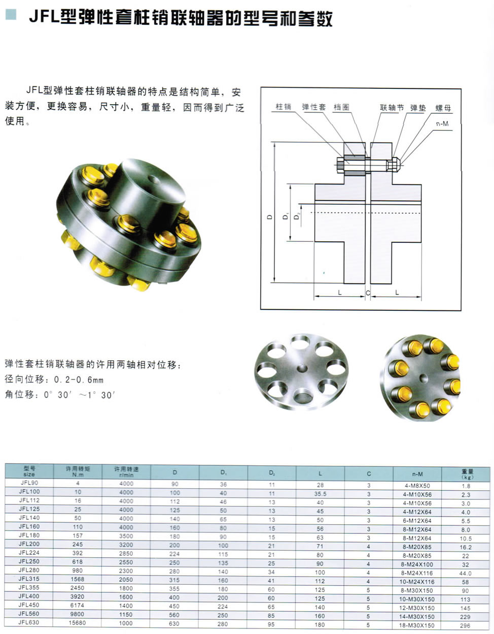 JFL型彈性套柱銷聯軸器的特點是結構簡單,安裝方便 ,更換容易,尺寸小,重量輕,因而得到廣泛使用 。