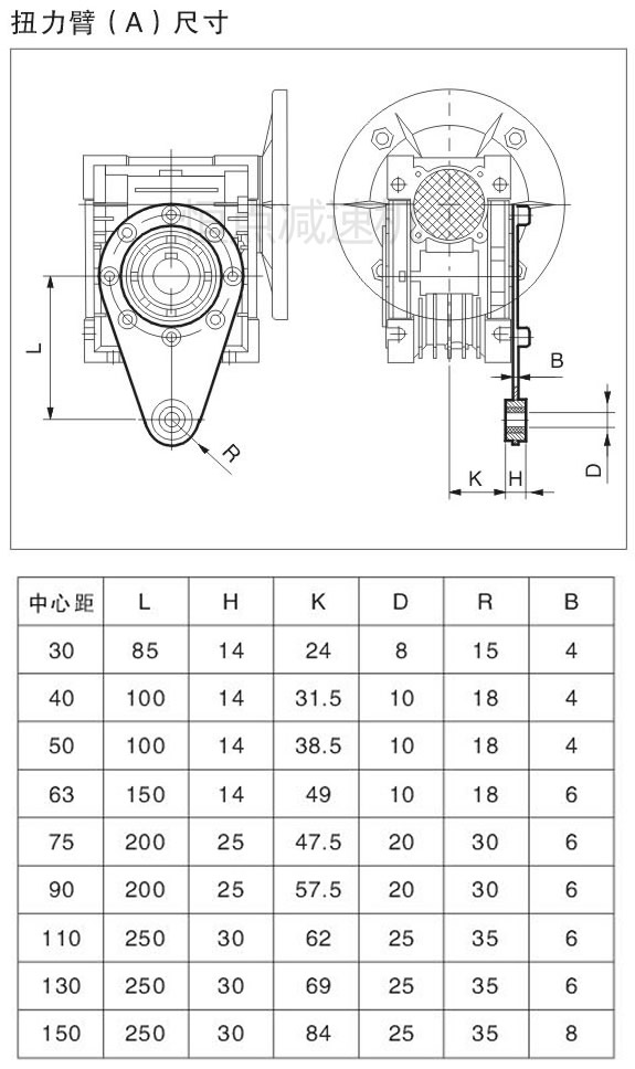 RV系列減速機的扭力臂的外型尺寸表
